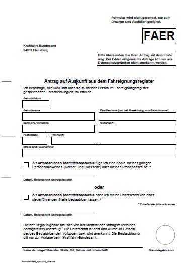 Formular zur Auskunft aus dem Fahreignungsregister
